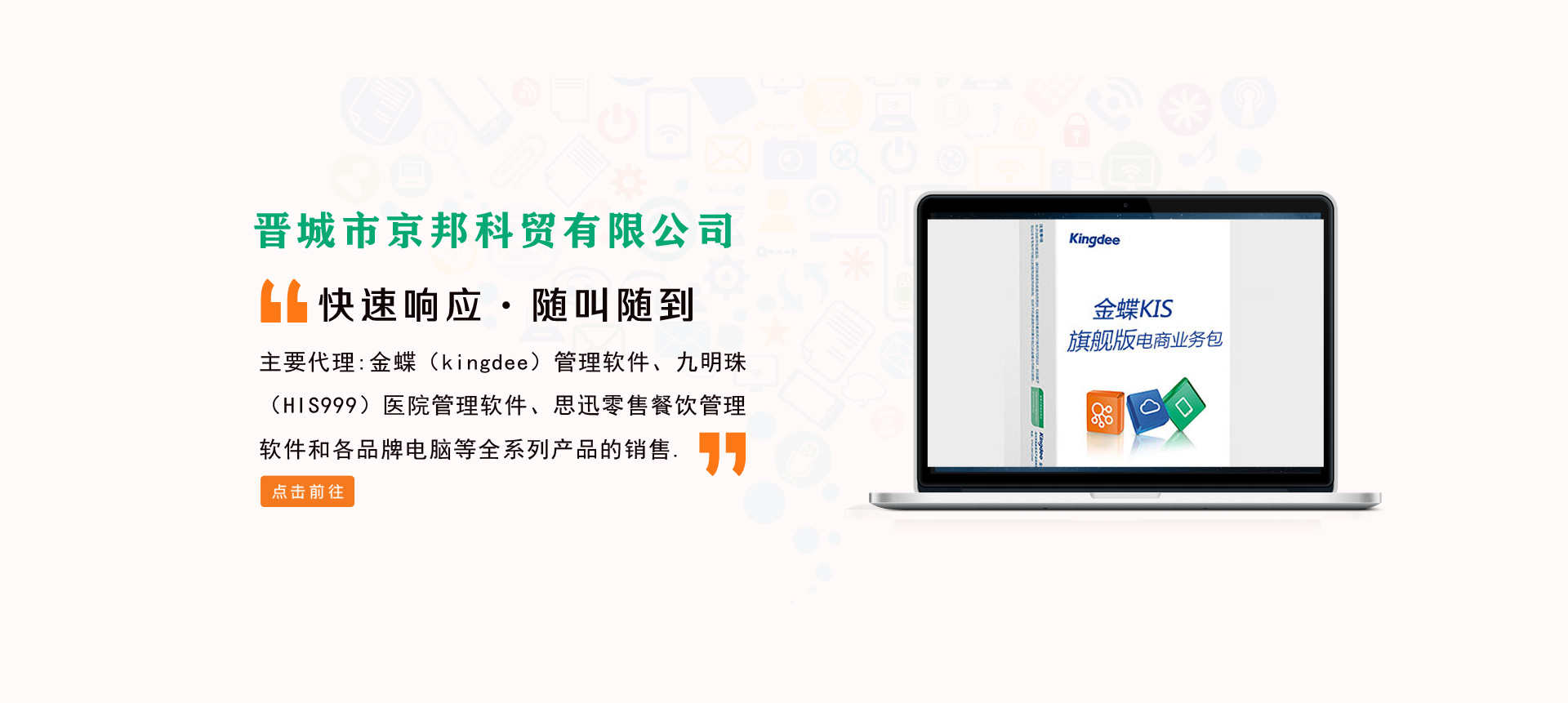 晉城市京邦科貿(mào)有限公司成立于2006年,是經(jīng)晉城市工商行政管理局登記注冊(cè),主要從事軟件銷售、電腦銷售和企業(yè)管理咨詢等相關(guān)業(yè)務(wù),是金蝶軟件(中國(guó))有限公司、深圳九明珠信息科技有限公司、深圳萬國(guó)思迅軟件有限公司在晉城地區(qū)高級(jí)代理商,主要代理金蝶(kingdee)管理軟件、九明珠(HIS999)醫(yī)院管理軟件、思迅零售餐飲管理軟件和各品牌電腦等全系列產(chǎn)品的銷售。